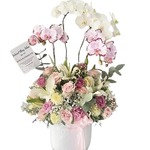Rangkaian bunga meja ini adalah simbol dari keanggunan dan kemewahan. Perpaduan antara mawar segar, lily casablanca yang harum, gompie yang eksotis, phalaenopsis elegan, dan baby breath yang lembut menciptakan komposisi yang memikat. Dirancang secara eksklusif oleh tim Raja Florist Semarang, produk ini sempurna untuk mempercantik ruangan, menyambut tamu, atau menjadi hadiah spesial bagi orang tersayang.
