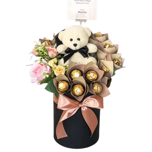 🍫🎀 Flower Box Eksklusif – Mawar Artificial, Ferrero Rocher & Boneka Lucu 🎀🍫