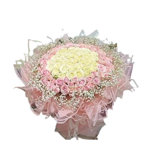 Wujudkan momen romantismu dengan Hand Bouquet 100 Tangkai Mawar Pink & Putih dari Raja Florist Semarang.