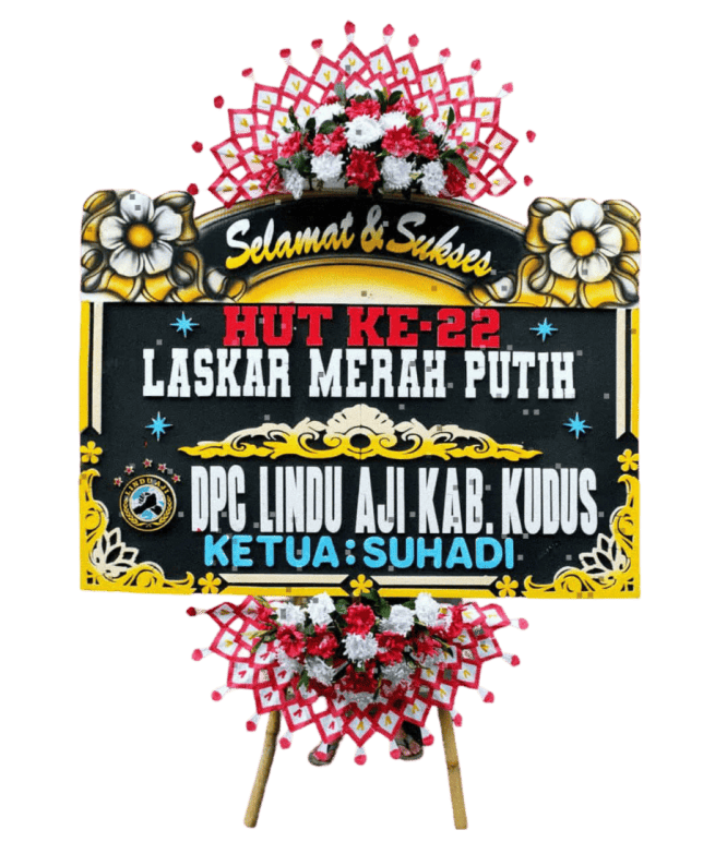 Meski tanpa rangkaian bunga segar, papan ini tetap tampil profesional dengan desain visual menarik, warna cerah, dan ucapan yang bisa disesuaikan sesuai acara.
